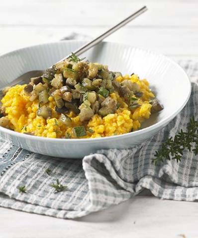 Serveer de risotto in diepe borden en leg er de gebakken groenteblokjes in het midden op.