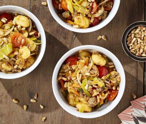 - 5 Meng de gnocchi onder de groenten. Kruid met peper en zout en bestrooi met de pijnboompitten.