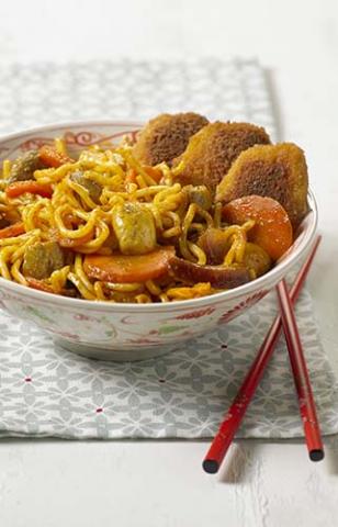 Serveer de krokante nuggets en de gewokte noedels en groenten in diepe kommen.