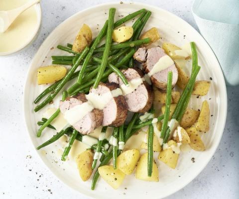 - Haal het varkenshaasje uit de oven en laat kort rusten onder aluminiumfolie. Snij het in plakjes. Serveer de plakjes varkenshaasje met de boontjes, gebakken aardappelen en de mosterdsaus.