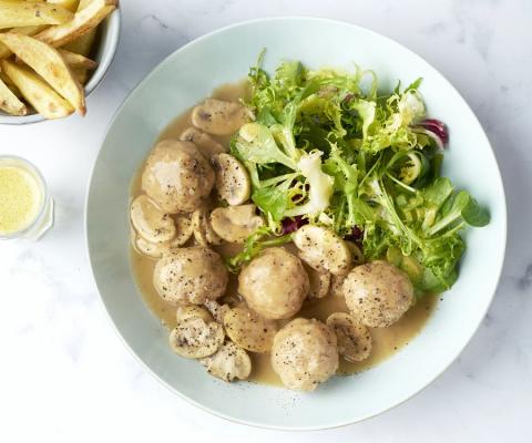 - Borstel de champignons schoon en snij in plakjes. Doe het gehakt in een kom en meng er het paneermeel door. Kruid met peper en zout. Rol er met vochtige handen balletjes van, ongeveer 5 balletjes per persoon.