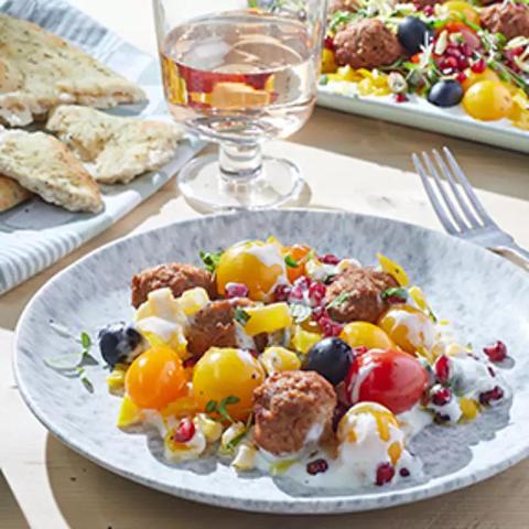 Giet de olijven af en spoel onder koud water. Verdeel de kefir over een serveerschaal en schik er de geroosterde groenten en de balletjes op. Bestrooi met de olijven en de granaatappelpitten.